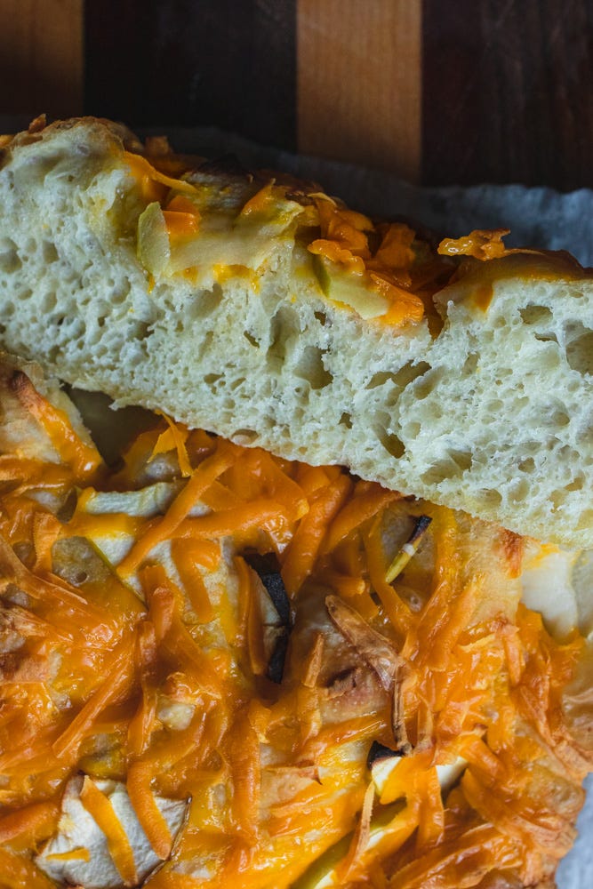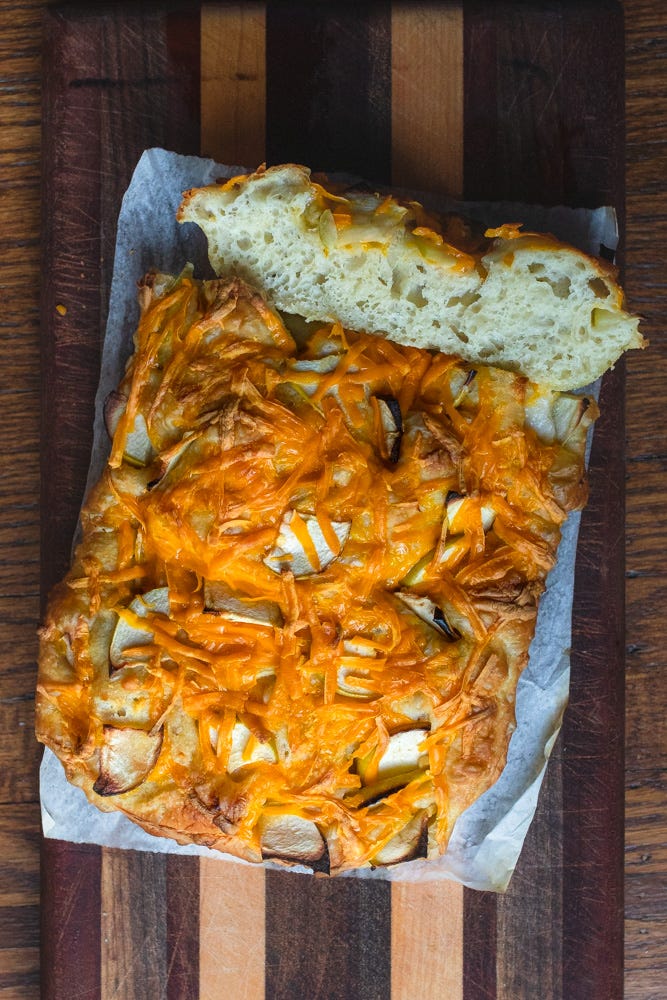 A light, airy, and crispy focaccia topped with melty cheddar cheese and piled high with thinly sliced apples.