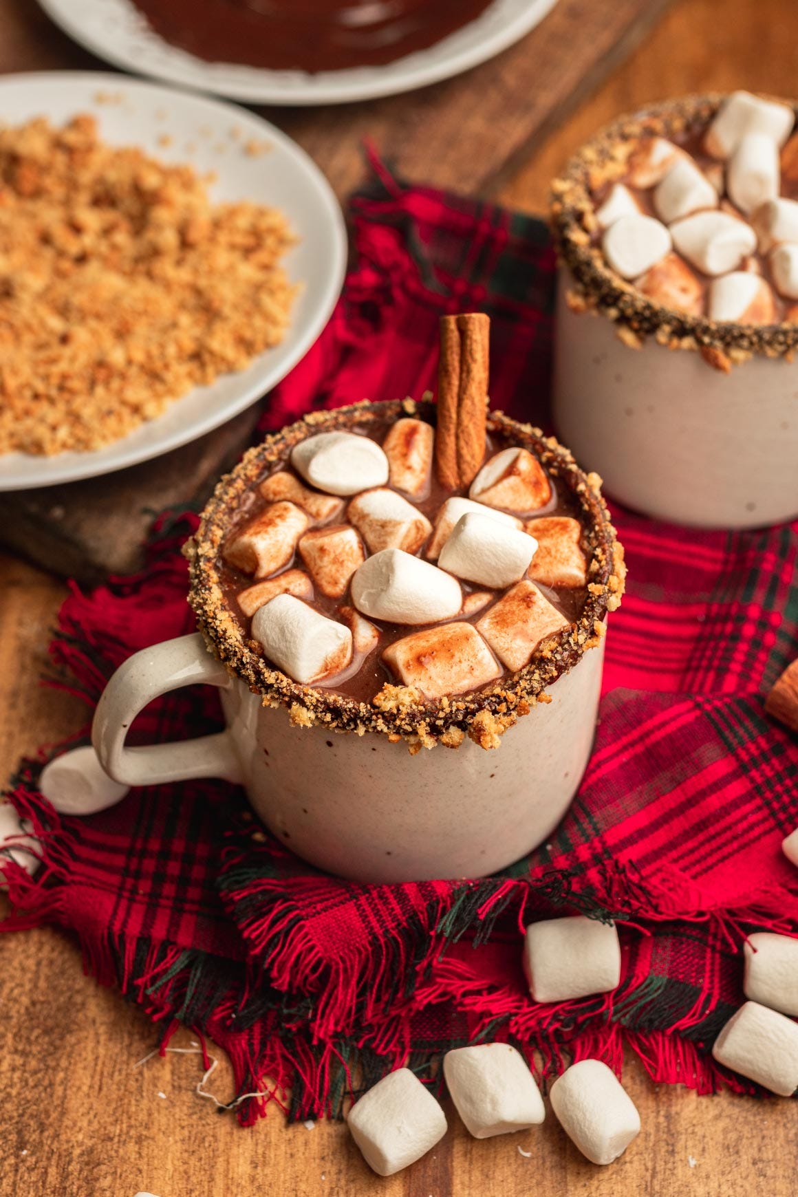 (Optional) Place chopped chocolate on a shallow plate or dish and microwave chocolate in 20 second intervals until melted. Place crushed gingersnap cookies on a second shallow plate or dish. Dip each mug rim into melted chocolate, then into the crushed cookies and set aside while you make the hot chocolate.