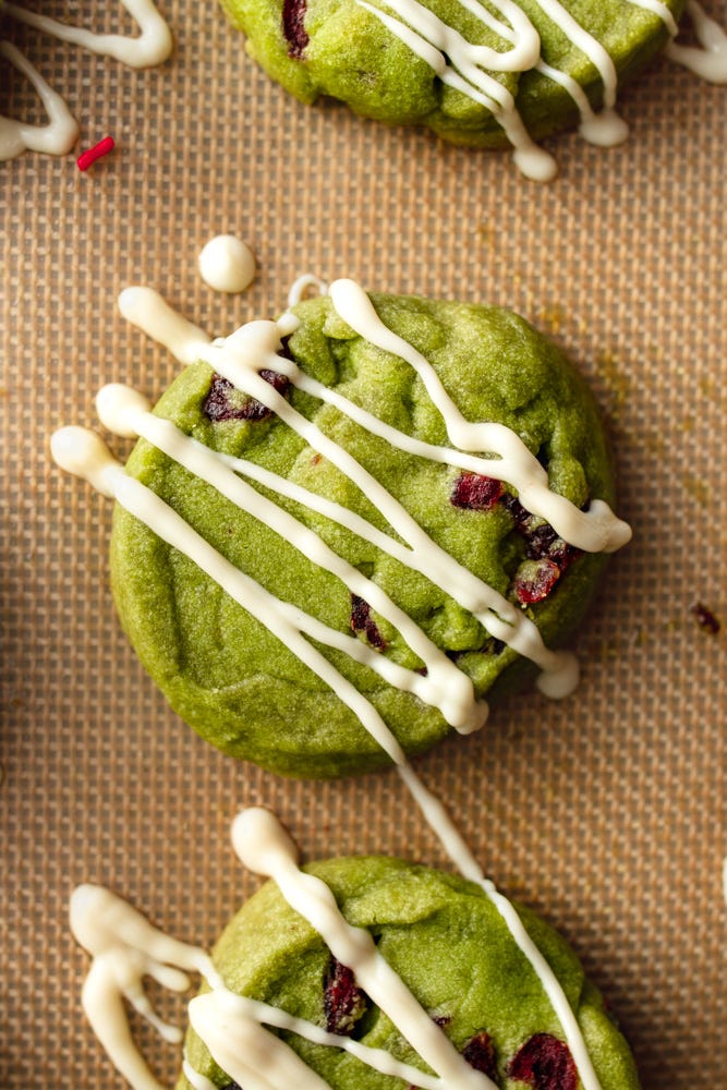 A soft and tender matcha shortbread cookie with dried cranberries and a dairy-free white chocolate drizzle. A super simple cookie with festive vibes that’s sure to have all your friends and family asking for the recipe. This is the recipe for all the matcha lovers out there.