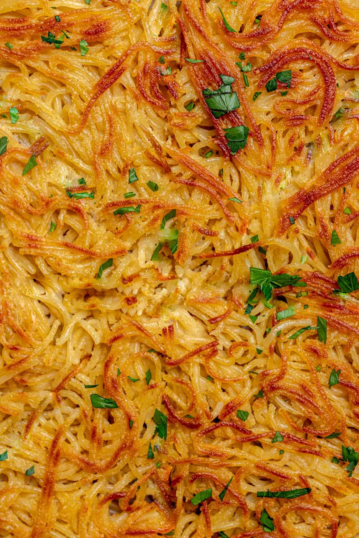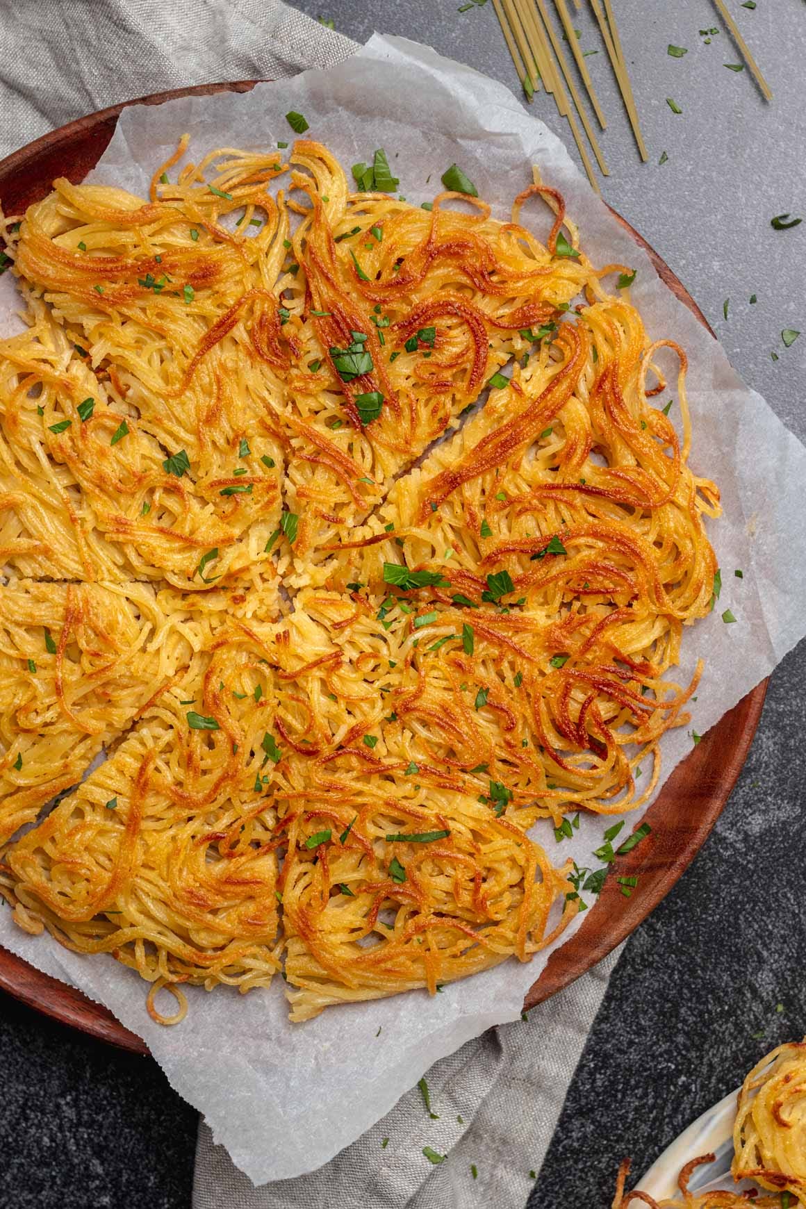 Add a thin layer of pasta to the heated non-stick pan so it’s like a pasta pancake just smaller than the size of the pan you’re using. Cook until the bottom is a deep golden brown and it starts getting crispy around the edges. You may need to gently press it down with a spatula to get it flat. Shake the pan every couple of minutes to ensure it’s not stuck to the bottom. Flip and cook the other side until golden.