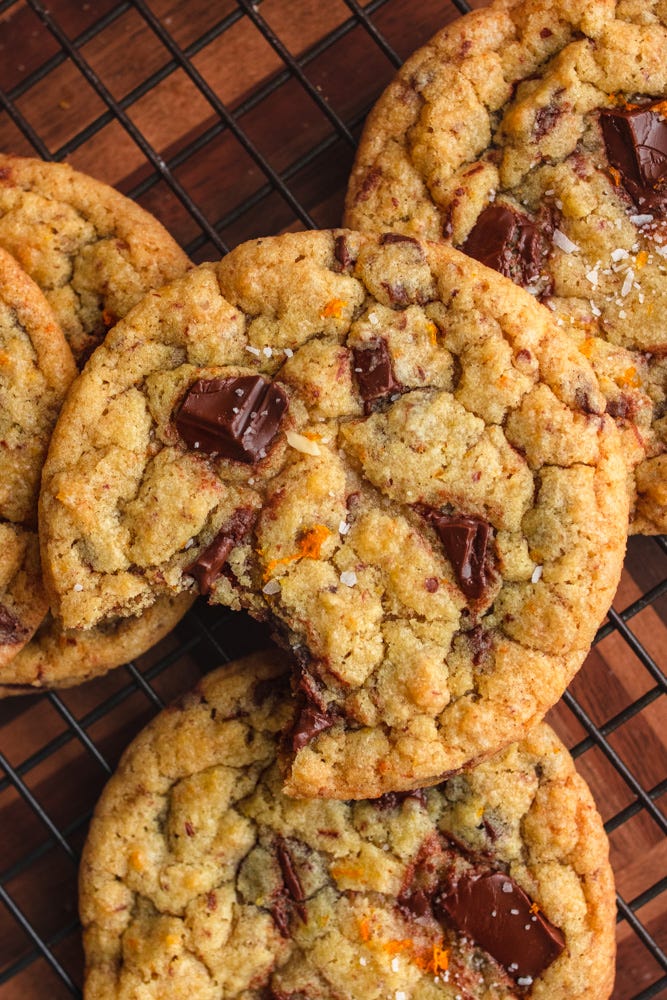 Soft and chewy with crispy edges, truly the perfect cookie combination. We started with our go-to chocolate chunk cookie recipe and swapped some of the liquid with fresh orange juice and massages the granulated sugar with orange zest so every bite has a wonderful burst of freshness.