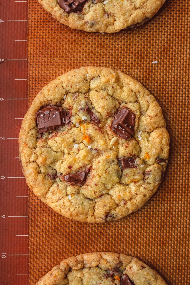 To make perfect round cookies, fresh from the oven, take a round cookie cutter just bigger than the cookies and scoot it around the cookie until perfectly round. Then sprinkle with some salt and let cool on the baking sheet for 5 minutes before transferring to a cooling rack.