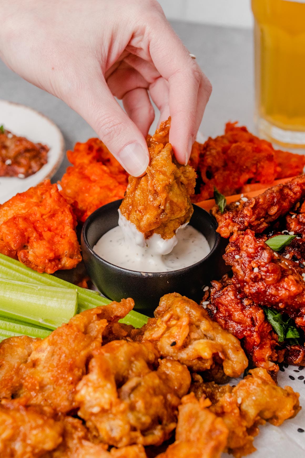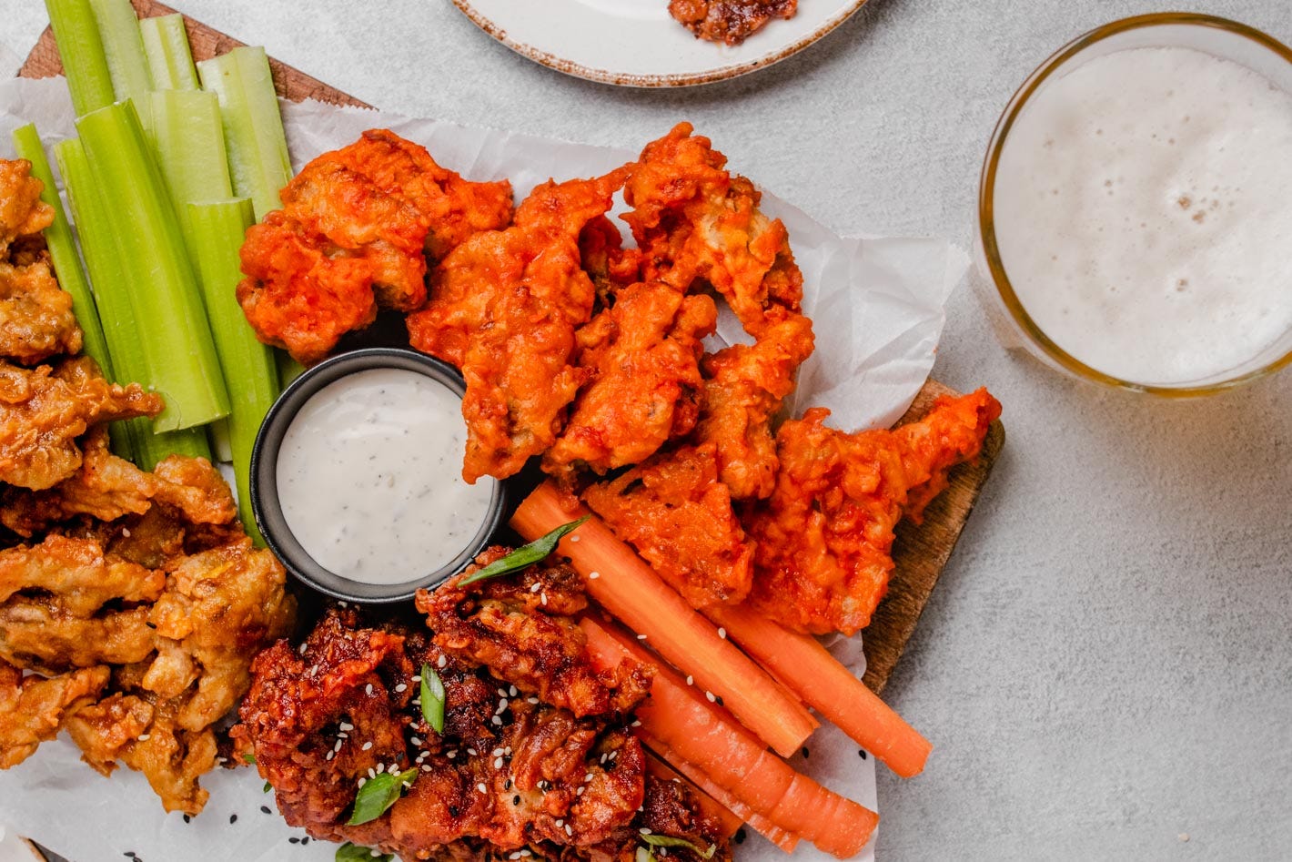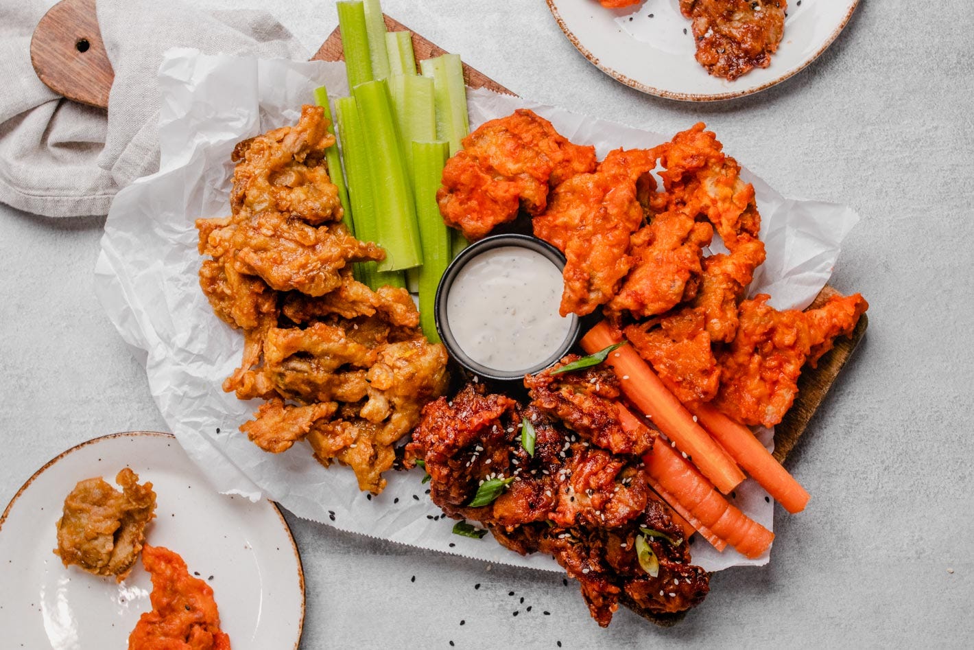 Crispy, meaty vegan wings made with oyster mushrooms and smothered in one of three delicious wing sauces; Buffalo, Maple Mustard, or Spicy Gochujang.