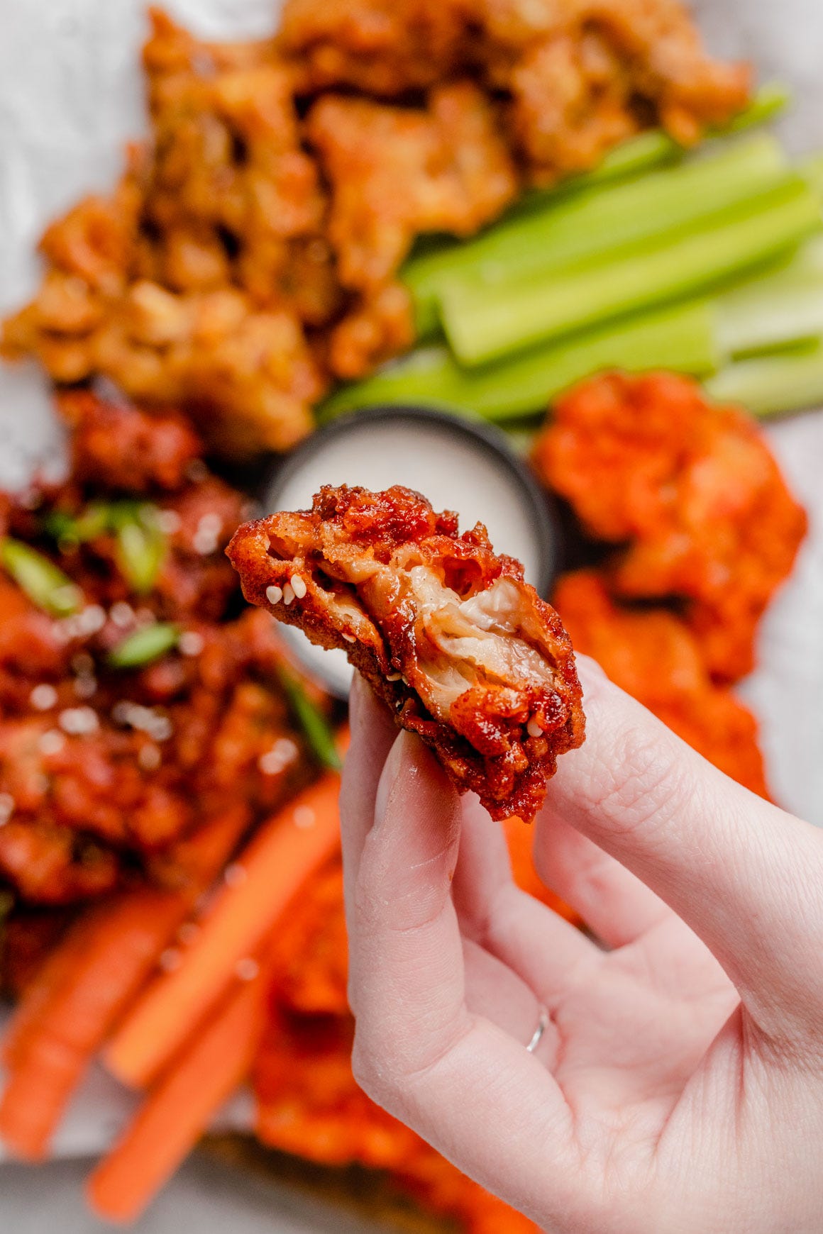 One of the foods we miss most had been a good, saucy chicken wing. Cauliflower wings are amazing but they don’t always satisfy the “meaty” craving. In this vegan wing we substituted cauliflower for meaty oyster mushrooms.