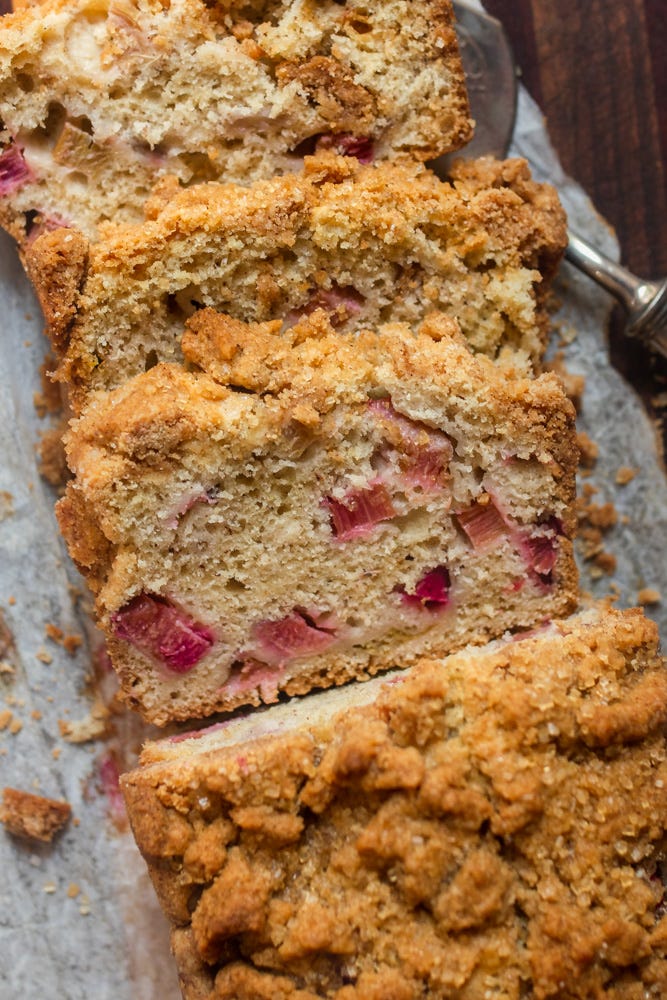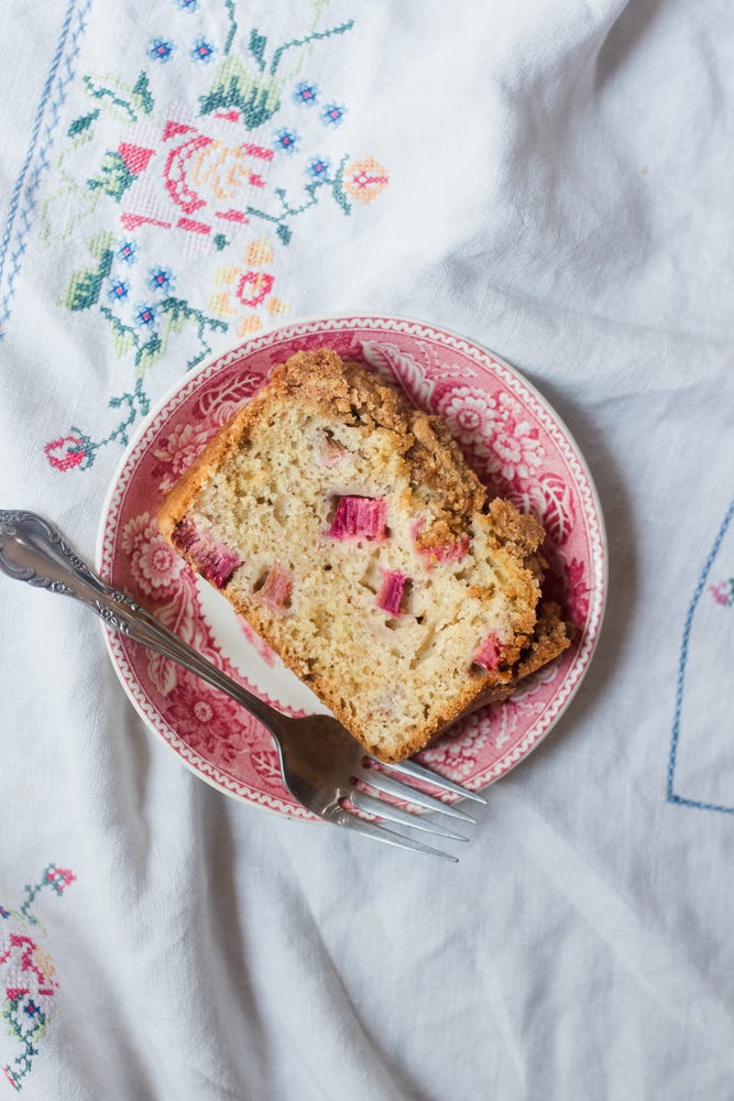 A moist and tender vanilla cake packed with fresh rhubarb pieces and topped with a cinnamon crumble.