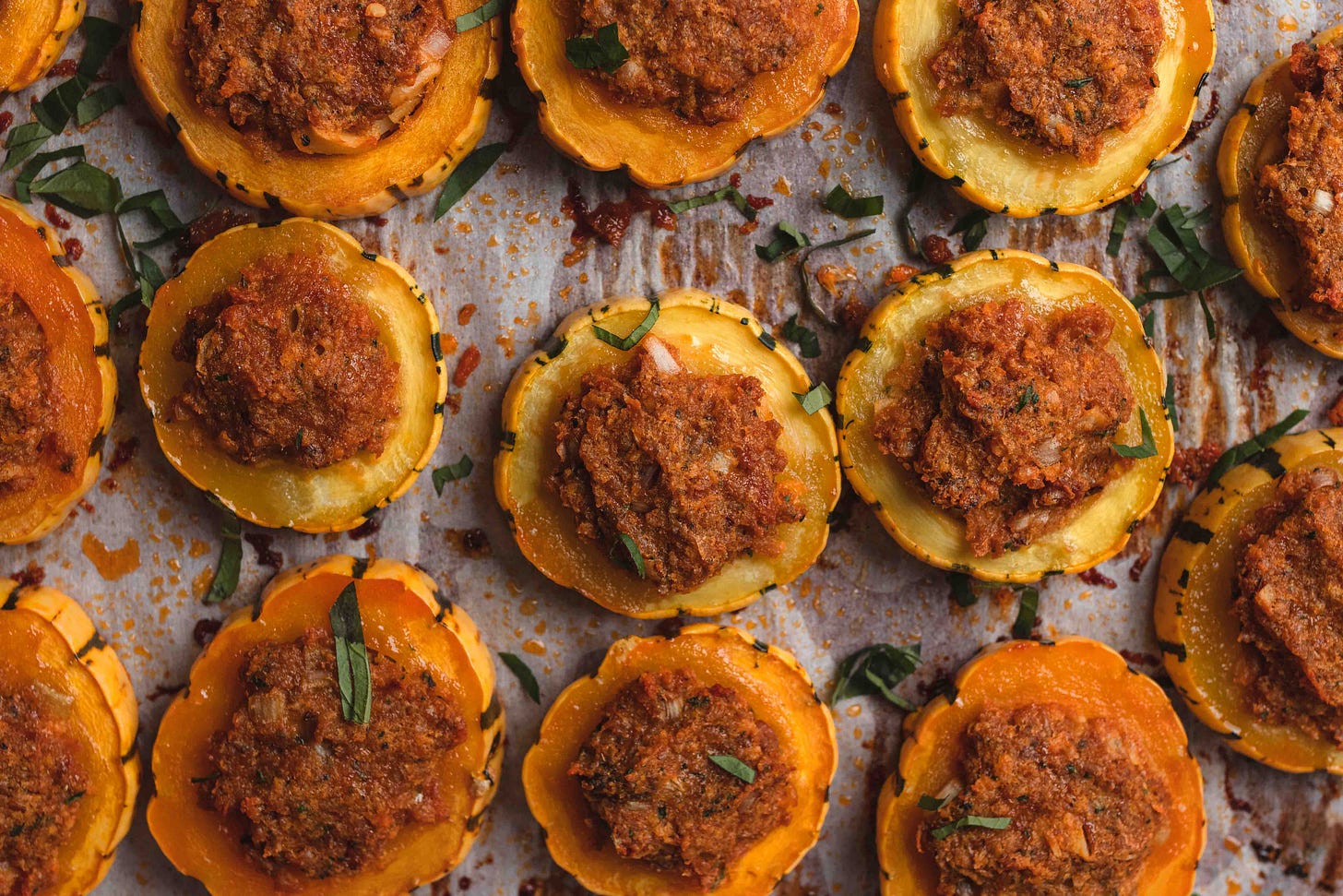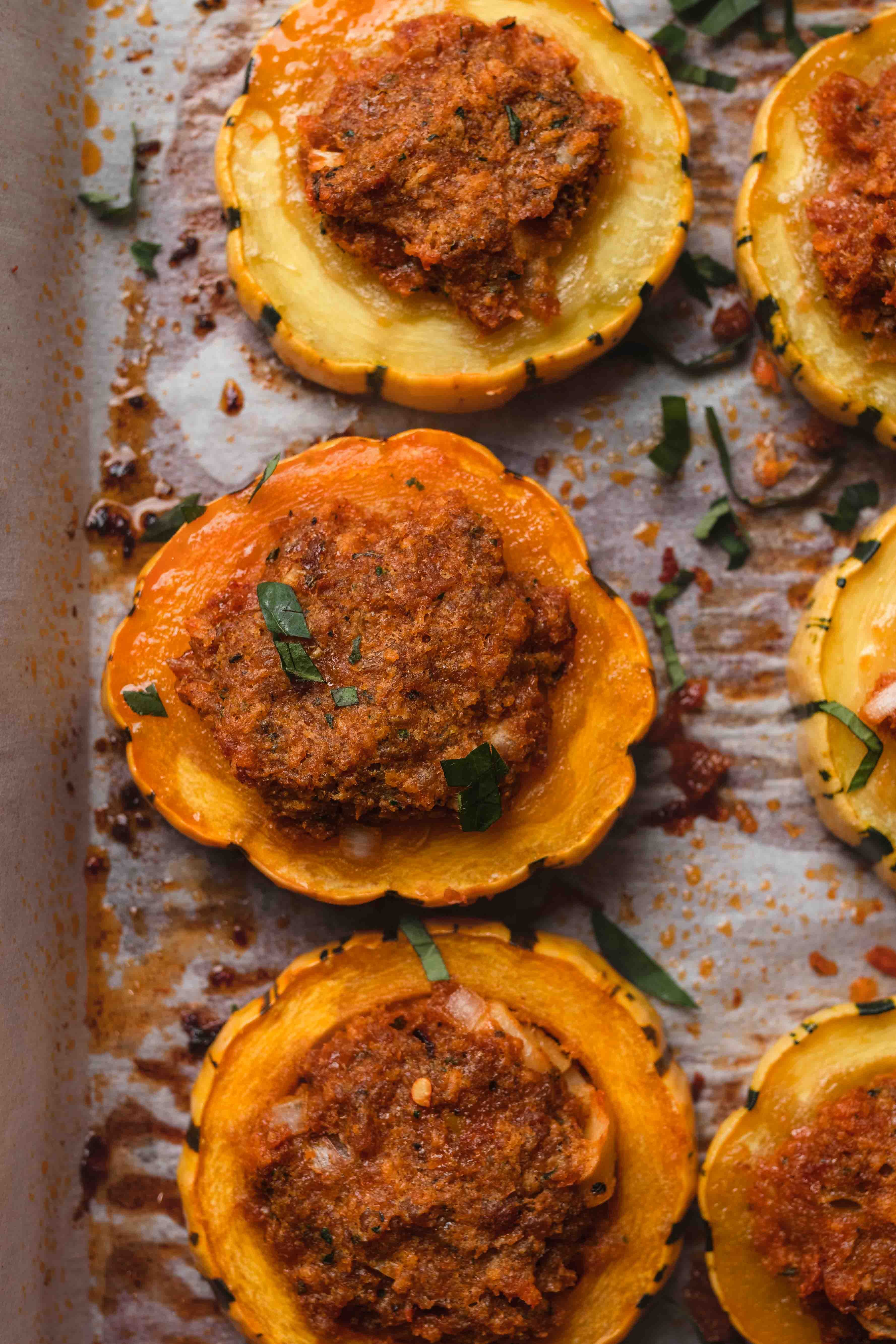 Divide the filling into as many even pieces as there are squash rings. Press the filling into the squash rings – it’s okay if the mound over the top of the ring.