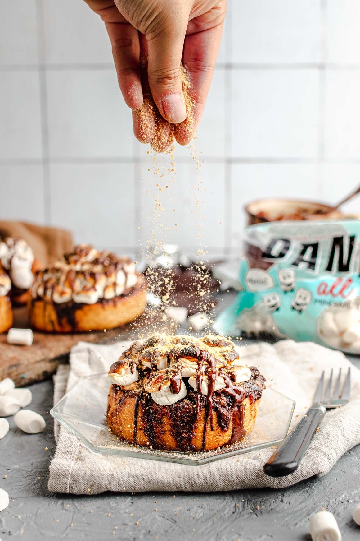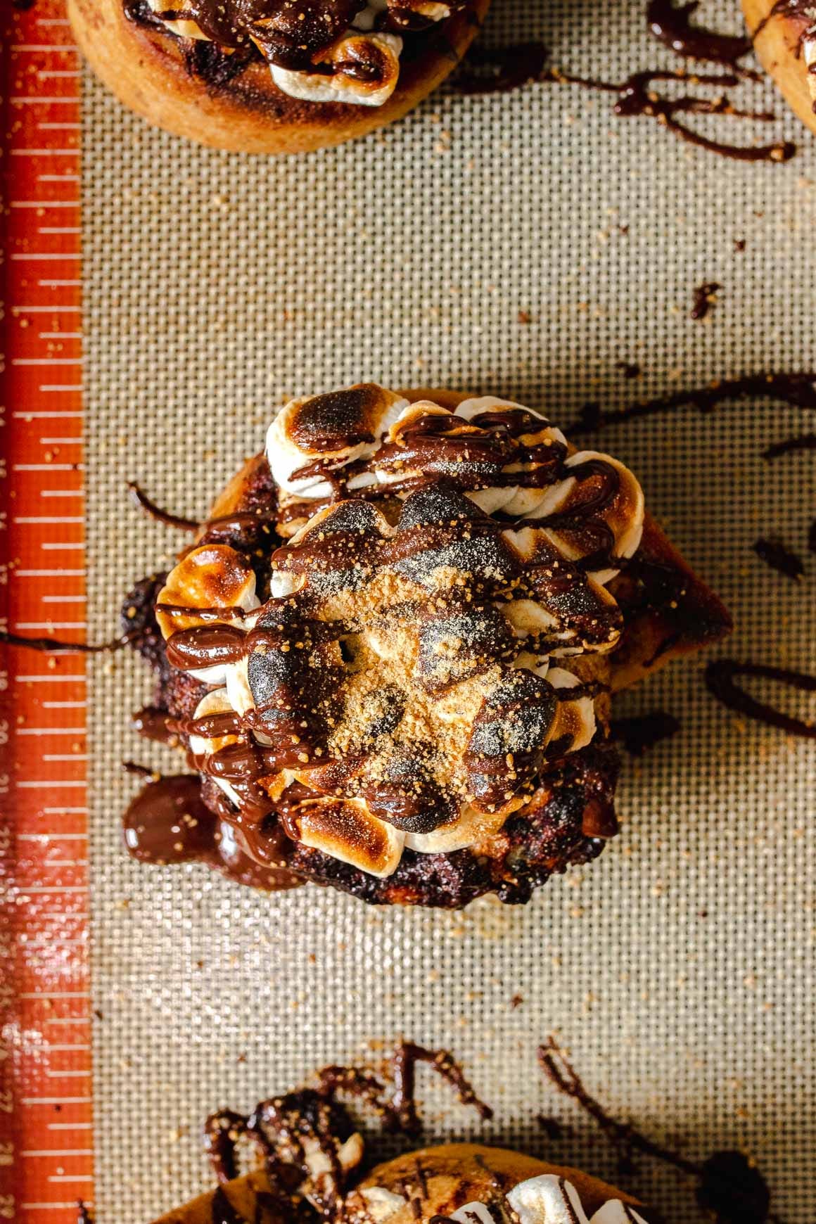 One of our favourite pastimes is taking our favourite sweets and combining them with s’mores. These s’mores cinnamon rolls may be our absolute favourite. Made with a graham cracker dough that is rolled with a chocolate and marshmallow filling. Then it’s topped with toasted marshmallows, a chocolate drizzle, and a sprinkle of graham cracker crumbs. So decadent, so good.