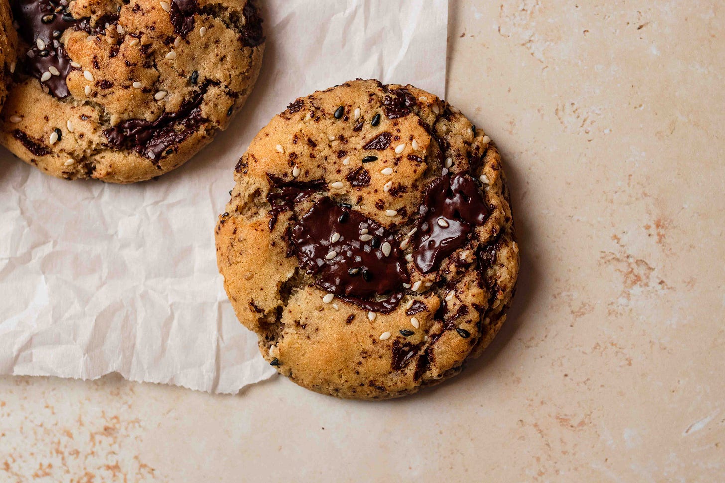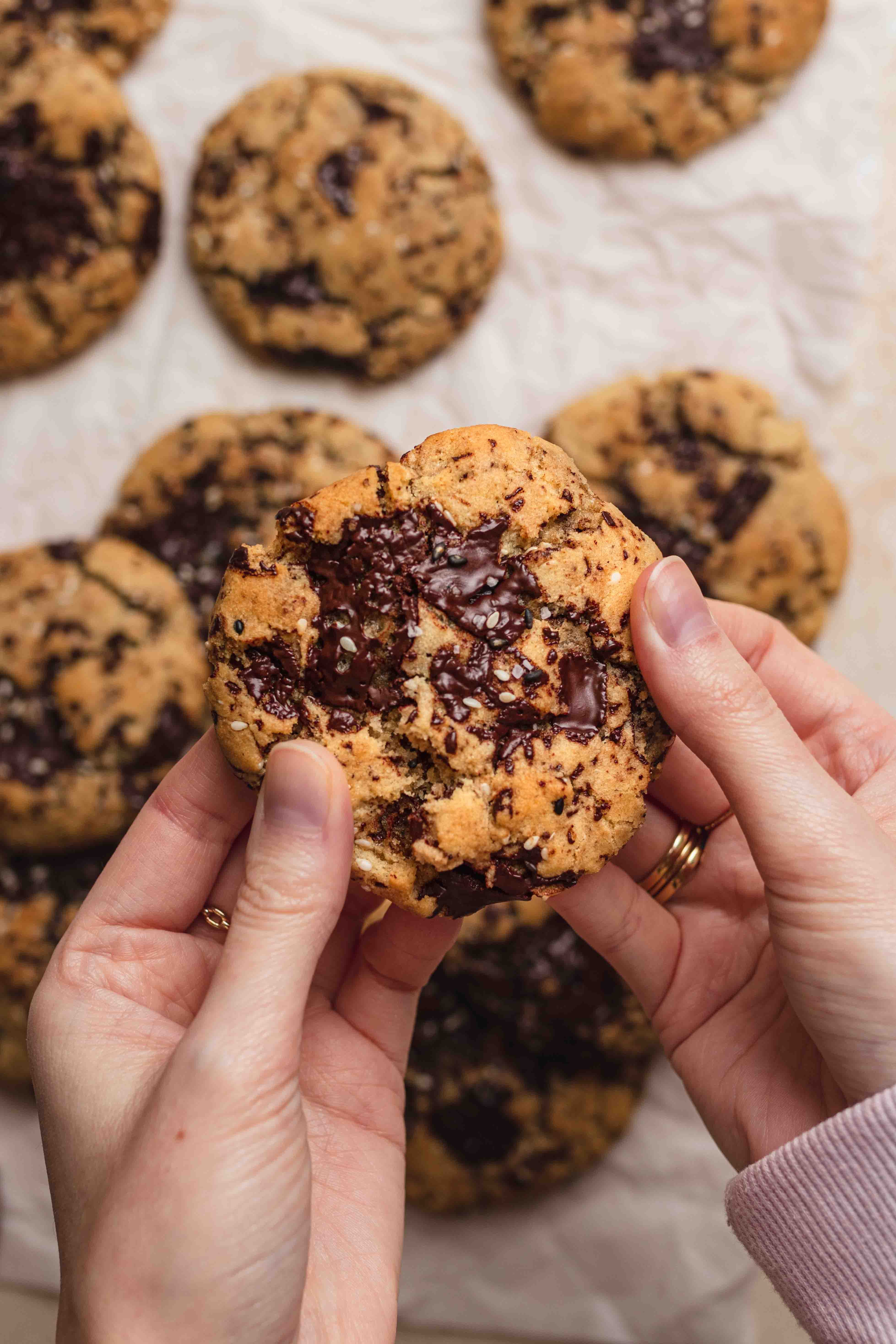 Crispy edges with a soft centre and puddles of melted dark chocolate in an earthy tahini cookie dough, every bite is more delicious than the next.
