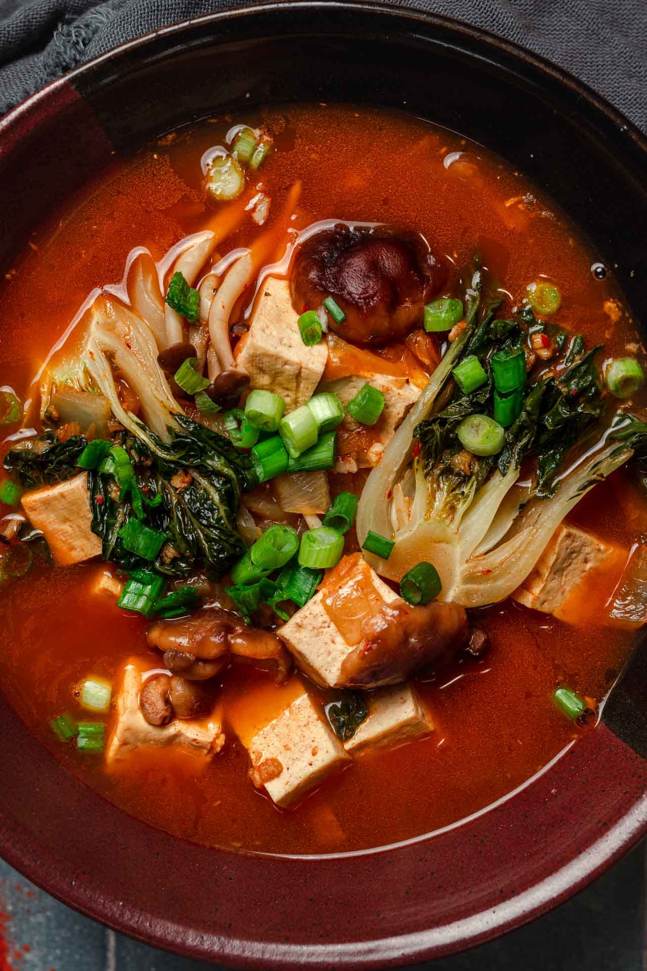 Vegan Kimchi Soup with Tofu, Mushrooms, and Bok Choy