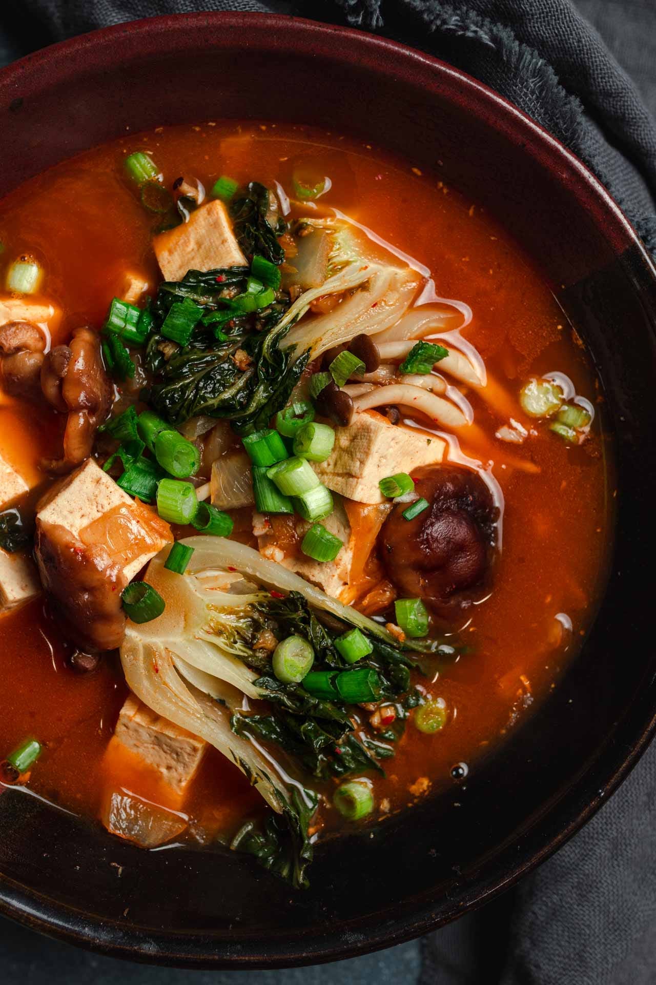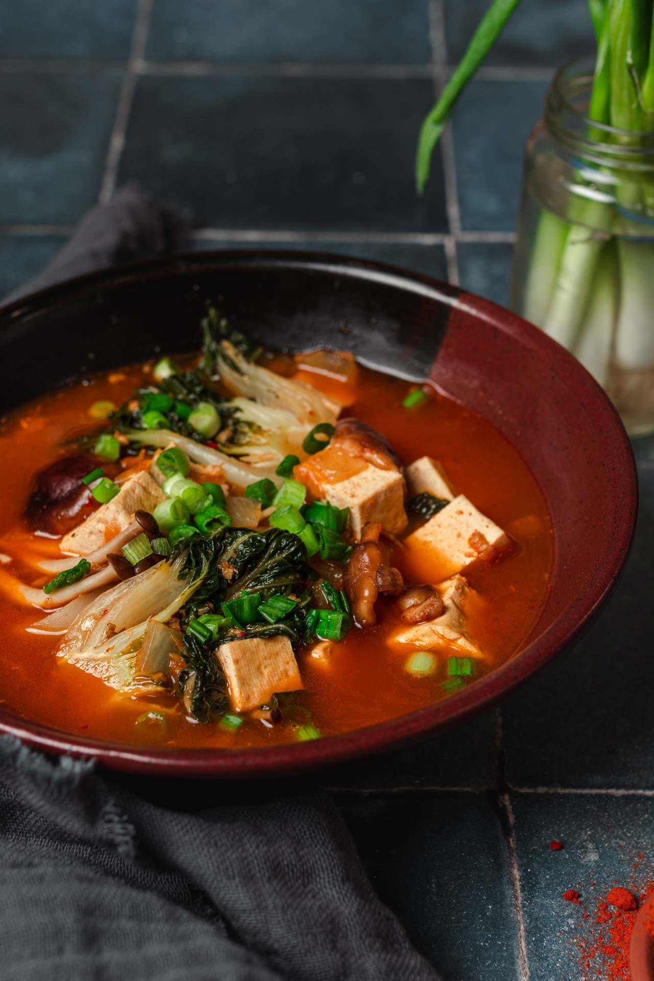 This vegan soup is inspired by Korean flavours with ingredients from other Asian cuisines like Chinese. Made with reference from Korean recipes like Kimchi jjigae (김치찌개) this recipe is our plant-based version of this traditional meal. Of course this recipe is by no means an authentic Korean recipe, which is why we didn’t include it in the recipe title, as neither of us are Korean. For more traditional Korean recipes check out Maanchi’s Kimchi jjigae or My Korean Kitchen’s Kimchi jjigae.