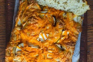 A light, airy, and crispy focaccia topped with melty cheddar cheese and piled high with thinly sliced apples.